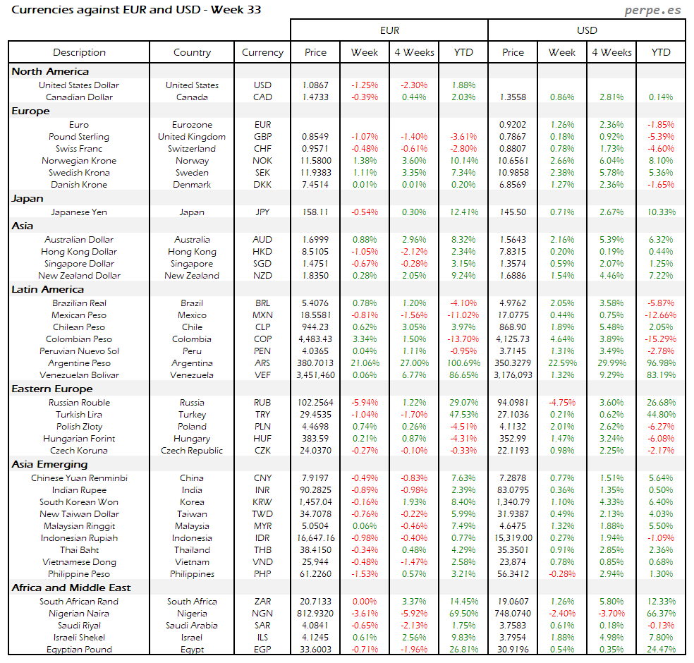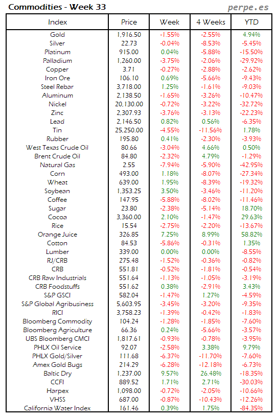 Resumen semanal bolsas, divisas y materias primas: Semana 33
