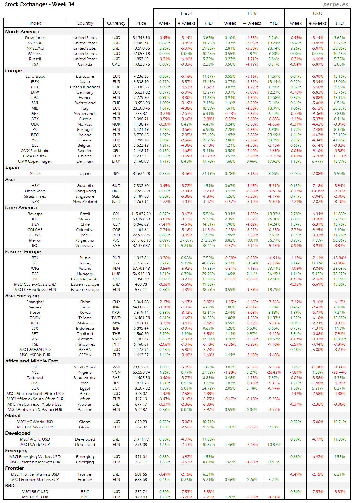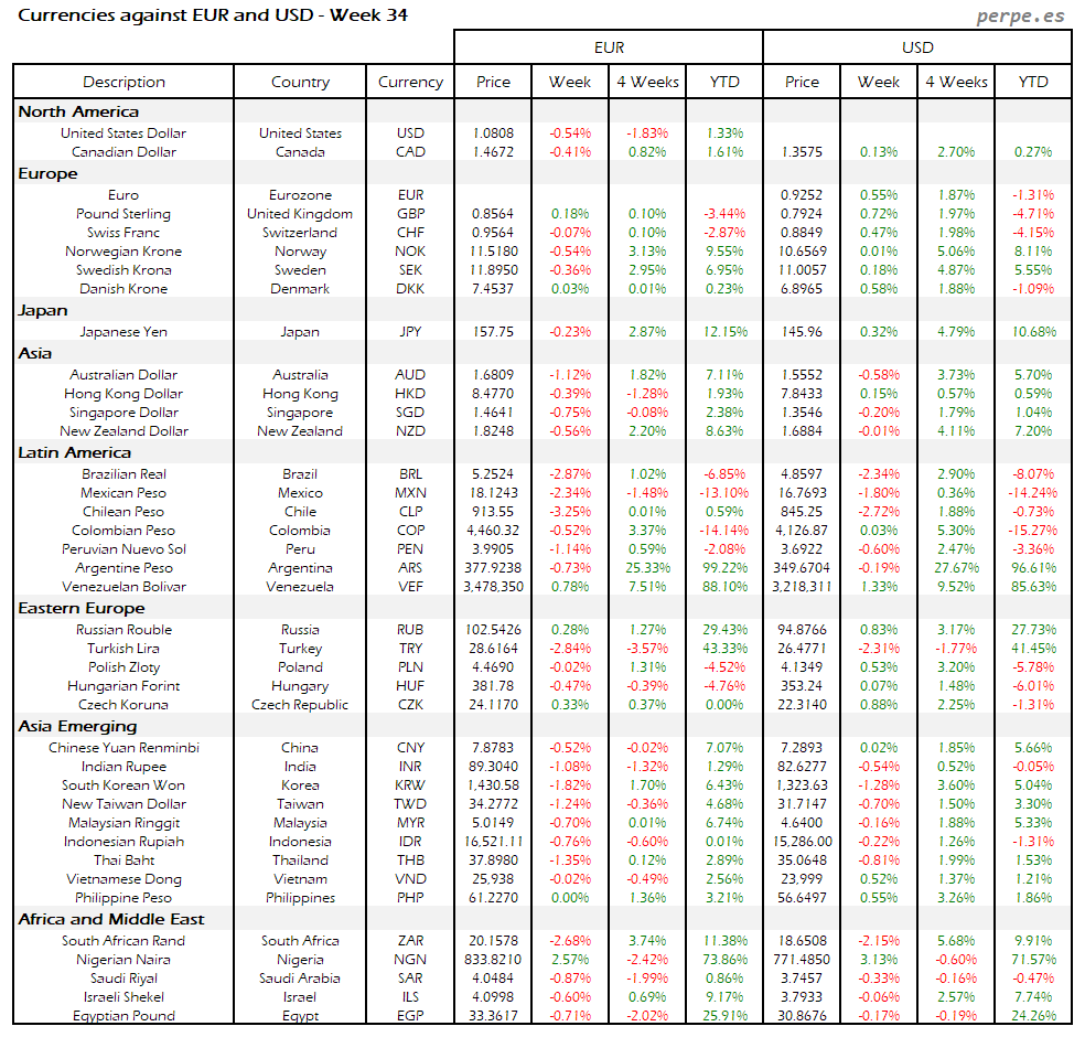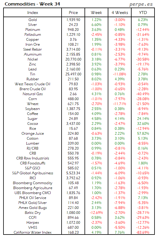 Resumen semanal bolsas, divisas y materias primas: Semana 34