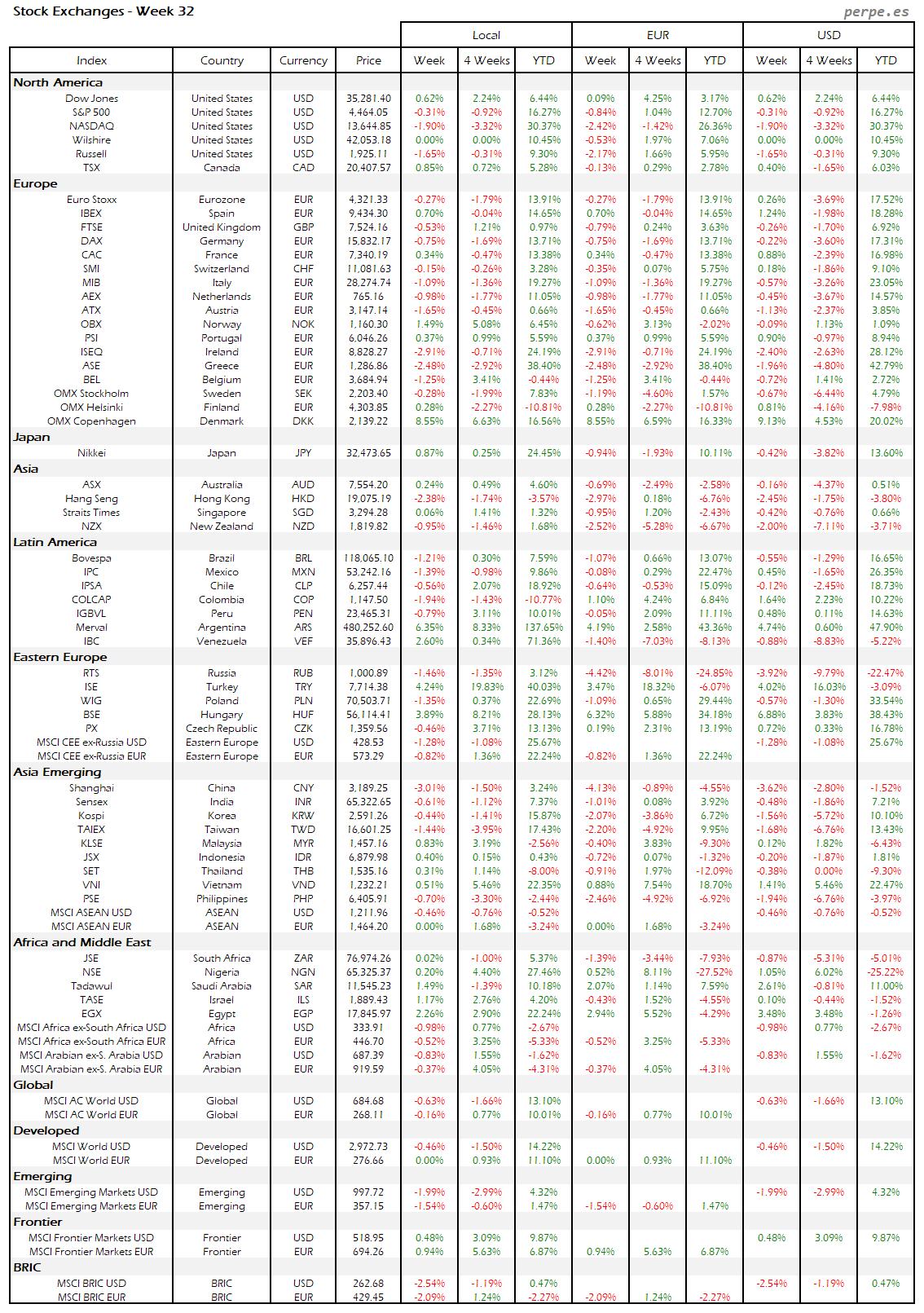 Resumen semanal bolsas, divisas y materias primas: Semana 32