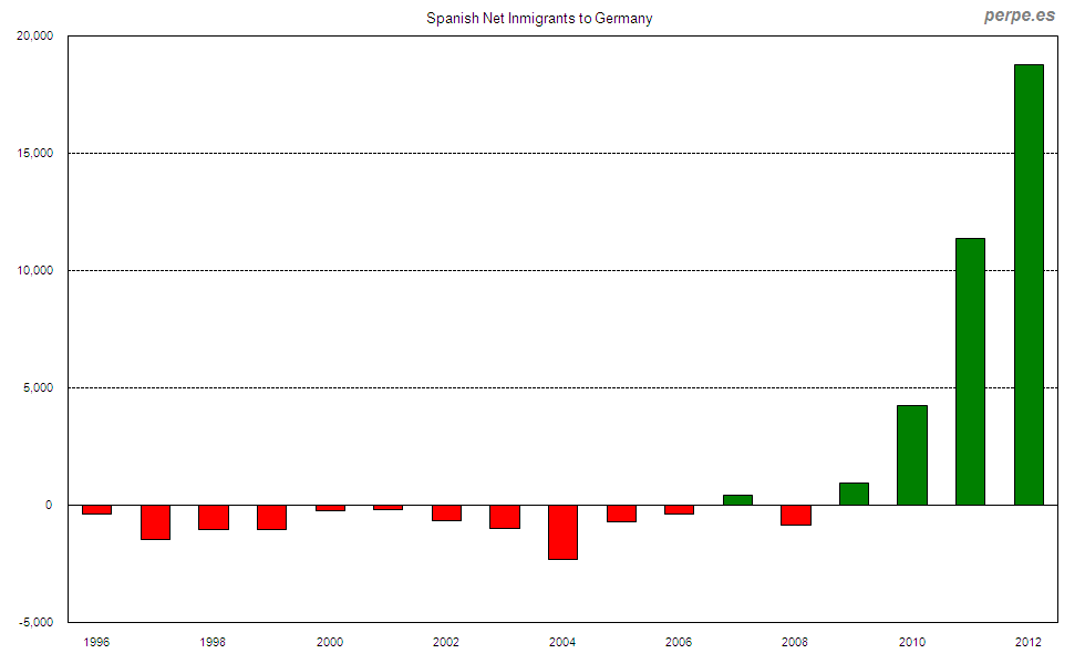España fue el séptimo país desde el que más inmigrantes llegaron en 2012, con un 3.1% del total de extranjeros, que alcanzó las 965,908 personas. Además, se coloca justo por detrás de Italia y Grecia, siendo los únicos de la Zona Euro entre los 10 primeros países. De hecho, sólo entre los tres representaron el 58% de los 183,441 emigrantes de la Zona Euro que entraron en Alemania el año pasado.