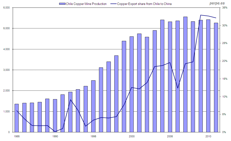 El gráfico de esta semana representa la producción anual en toneladas en las minas de cobre en Chile frente a las exportaciones de cobre de Chile a China en porcentaje sobre el total desde 1985.
