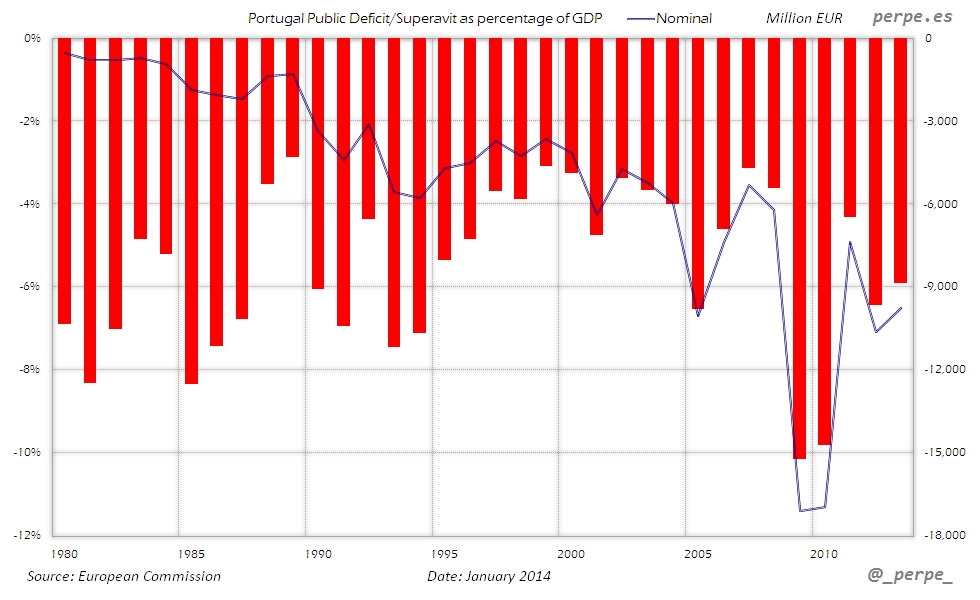 Déficit presupuestario en Portugal desde 1980 / Budget deficit in Portugal since 1980 Posted 15 January, 2014 by perpe