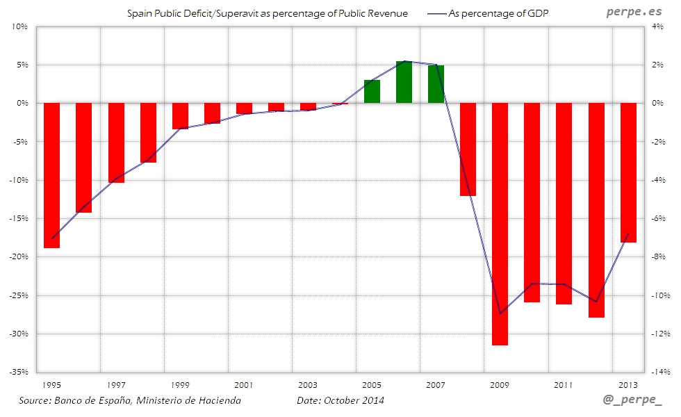 Déficit presupuestario en porcentaje sobre los ingresos en España desde 1995 / Budget deficit as percentage of revenue in Spain since 1995 Posted 23 October, 2014 by perpe