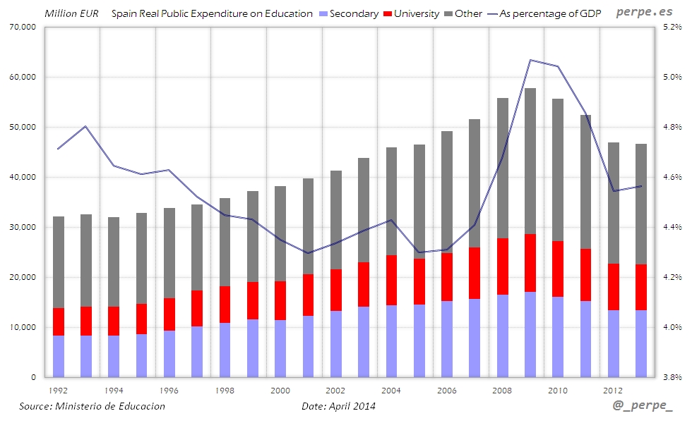 Gasto público real en educación en España desde 1992 / Real public expenditure on education in Spain since 1992 Posted 9 April, 2014 by perpe