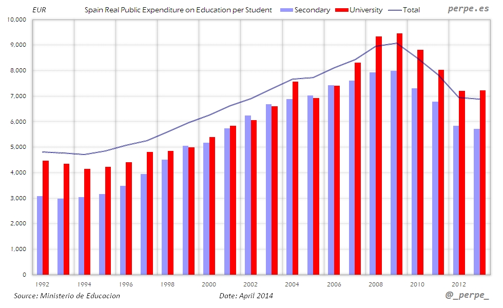 Gasto público real en educación por estudiante en España desde 1992 / Real public expenditure on education per student in Spain since 1992 Posted 9 April, 2014 by perpe