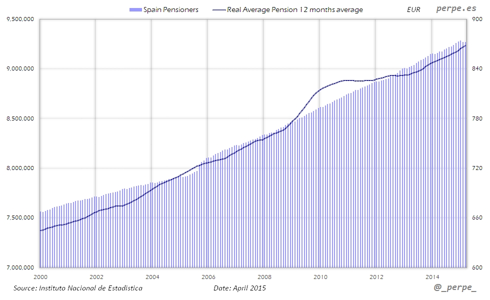 Pensionistas y pensión media en España desde 2000 / Pensioners and average pension in Spain since 2000 Posted 22 April, 2015 by perpe