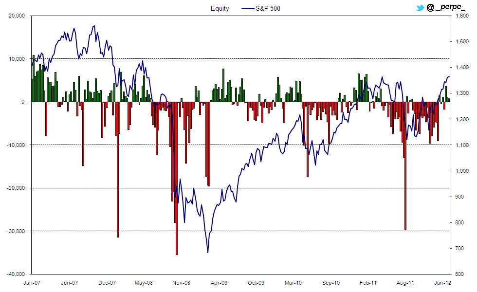 El gráfico de esta semana representa los flujos de fondos de inversión en la categoría de renta variable o acciones frente a la evolución semanal del índice S&P 500 desde el año 2007.