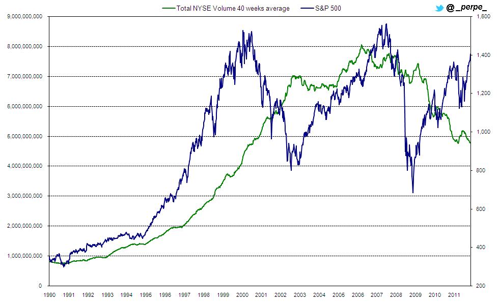 En las últimas semanas se está hablando bastante sobre lo bajo que está siendo el volumen en este rally desde principios de año. De hecho, en las 52 primeras sesiones del año se han negociado en media en NYSE 809 millones de acciones, lo que representa un 24% menos que el año anterior (1,062 millones) y un 27% menos que lo que se negoció en 2010 (1,110 millones) en el mismo periodo.